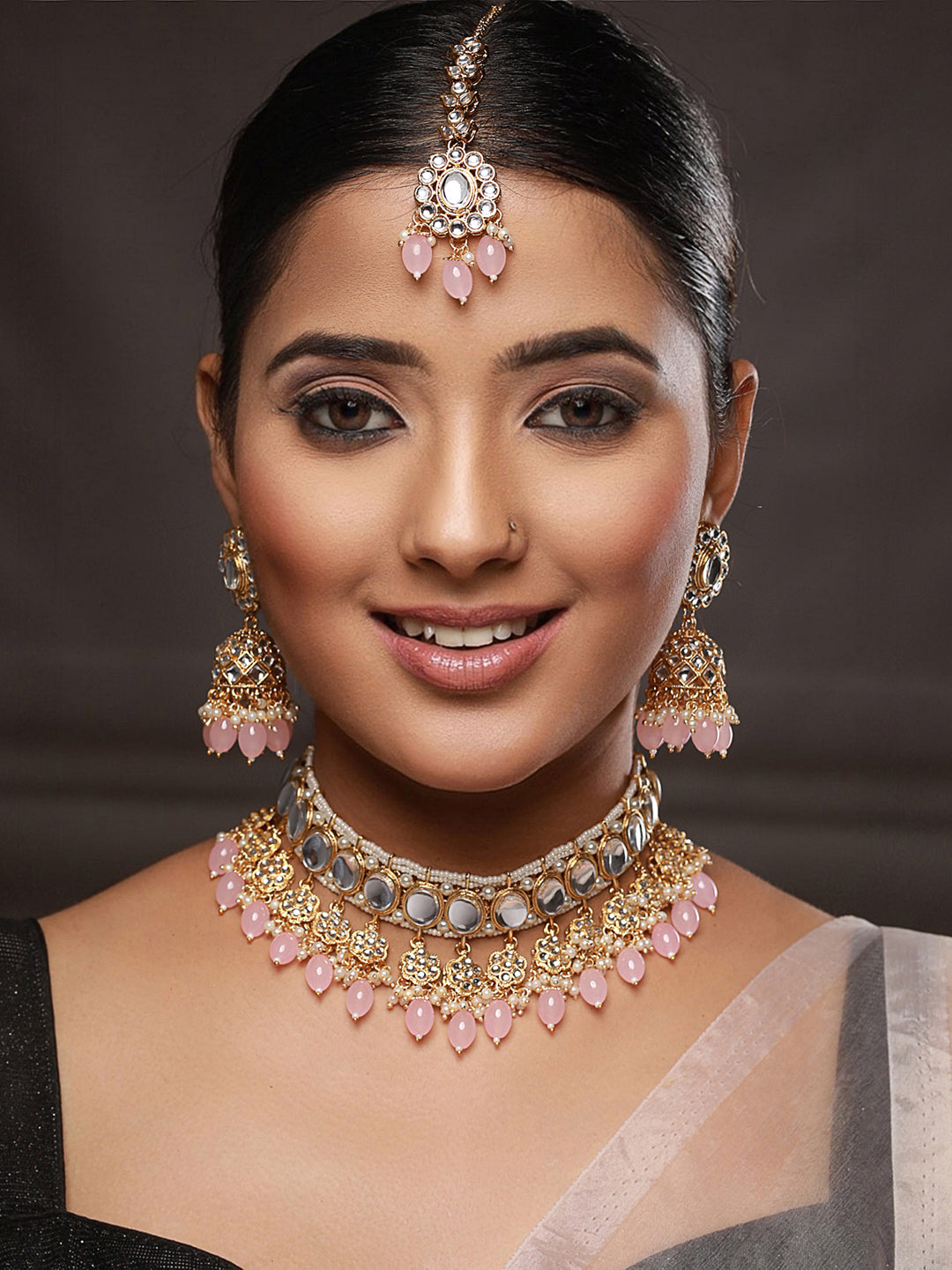 Priyaasi Pink Floral Kundan Gold-Plated Choker Jewellery Set with Maangtikka